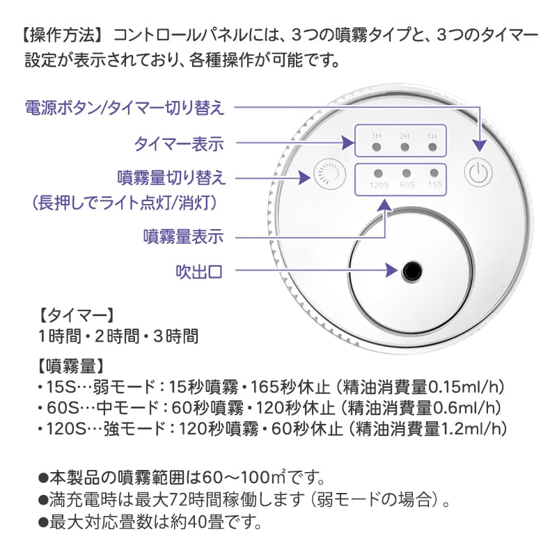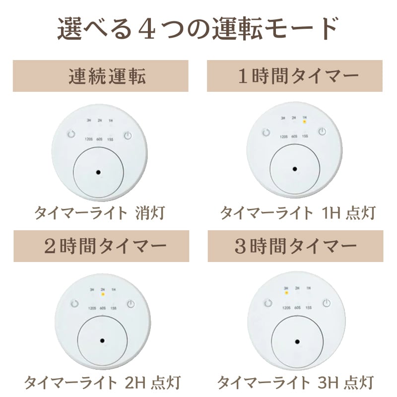 噴霧量は3段階、運転は連続運転と1,2,3時間のタイマー設定が可能です。